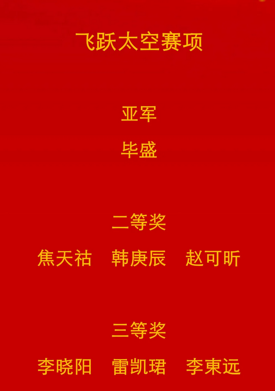 在飞跃太空赛项中,我校参赛选手取得了优异成绩,其中毕盛同学获得亚军。